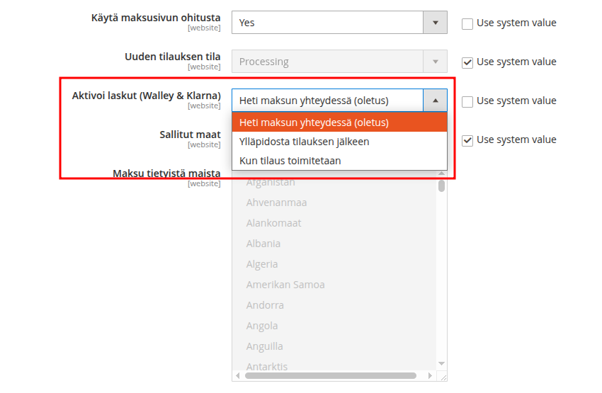 | Capture Invoices | Aktivoidaanko Walleyn ja Klarnan laskut heti tilauksen yhteydessä vai jälkikäteen |