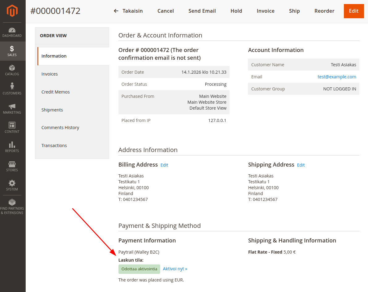 Mikäli aktivoinnissa tapahtuu esimerkiksi yhteysvirhe, näkyy epäonnistumisesta maininta tilauksen kommenteissa ja tilaksi jää Odottaa aktivointia. Aktivointia voi yrittää uudelleen Aktivoi nyt painikkeesta.