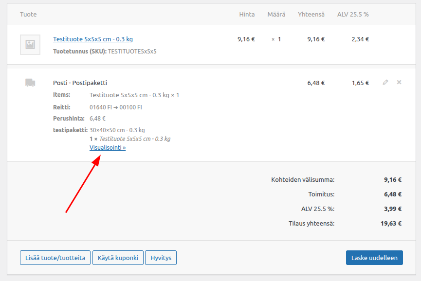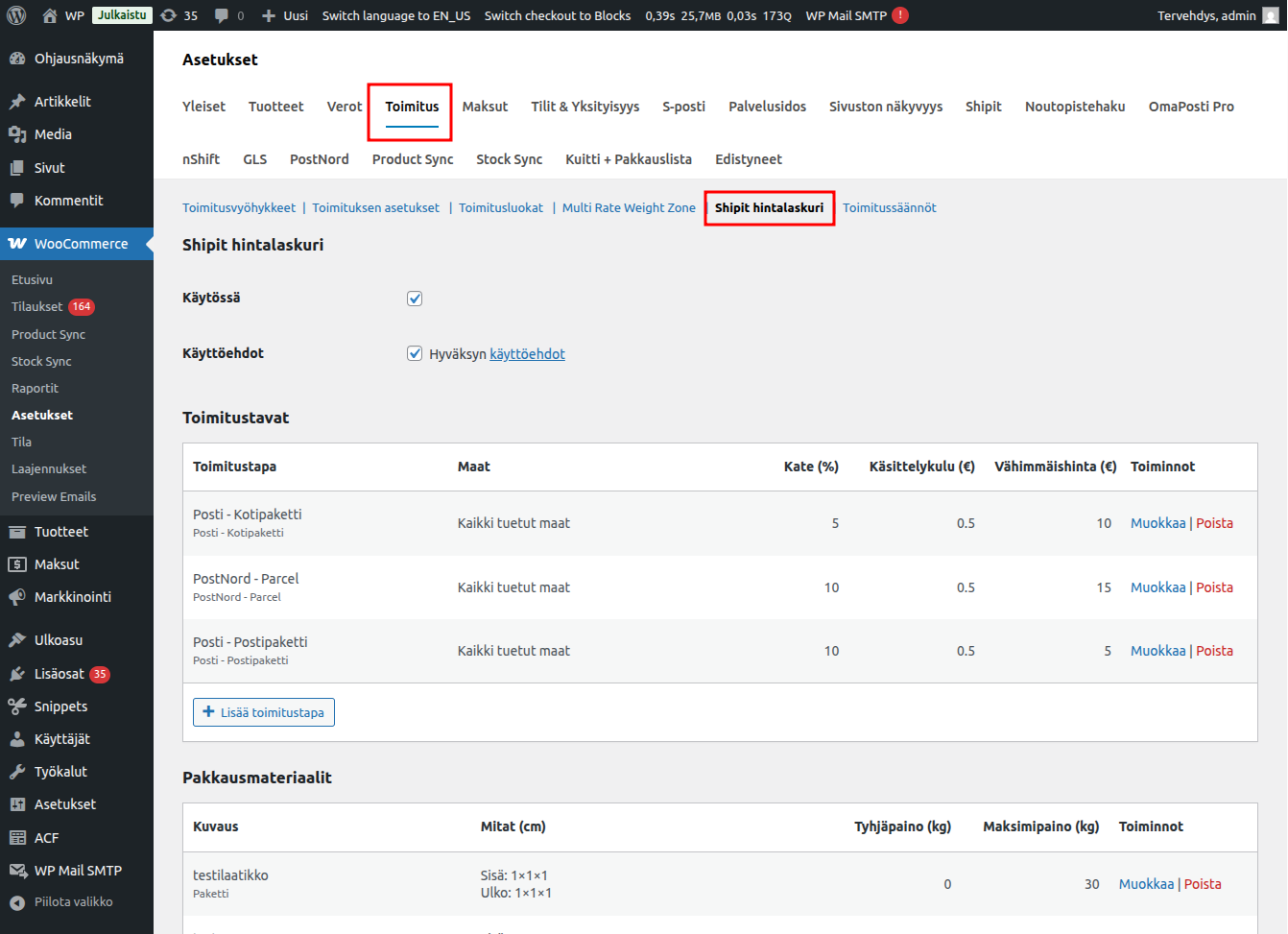 Lisäosan asetuksissa määritellään tarjottavat toimitustavat sekä pakkausmateriaalit. Asetukset löytyvät WooCommerce > Asetukset > Toimitus > Shipit hintalaskuri.
