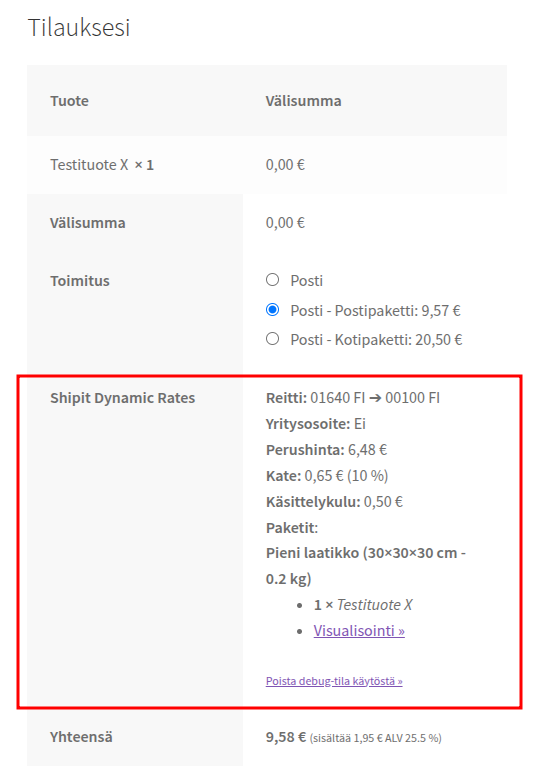 - Kytke debug-tila päälle kohdasta WooCommerce > Asetukset > Toimitus > Shipit hintalaskuri > Debug-tila