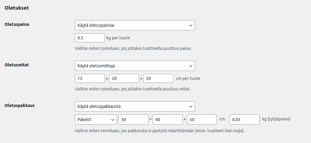 Mikäli tuotteille ei ole syötetty painoja tai mittoja, on mahdollista käyttää oletusarvoja. Silloin jokaiselle tuotteelle, jolta puuttuu paino tai mitta, käytetään asetuksiin syötettyä kiinteää arvoa. Ominaisuus on hyödyllinen erityisesti silloin, jos verkkokaupan tuotteet ovat suunnilleen yhtä suuria.
