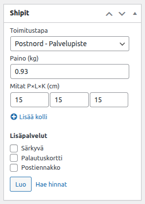 Kun asiakas on tehnyt tilauksen, ja tilauksessa on hyödynnetty laskuria, tulee Shipit-boksiin automaattisesti toimitustapa ja kollit:
