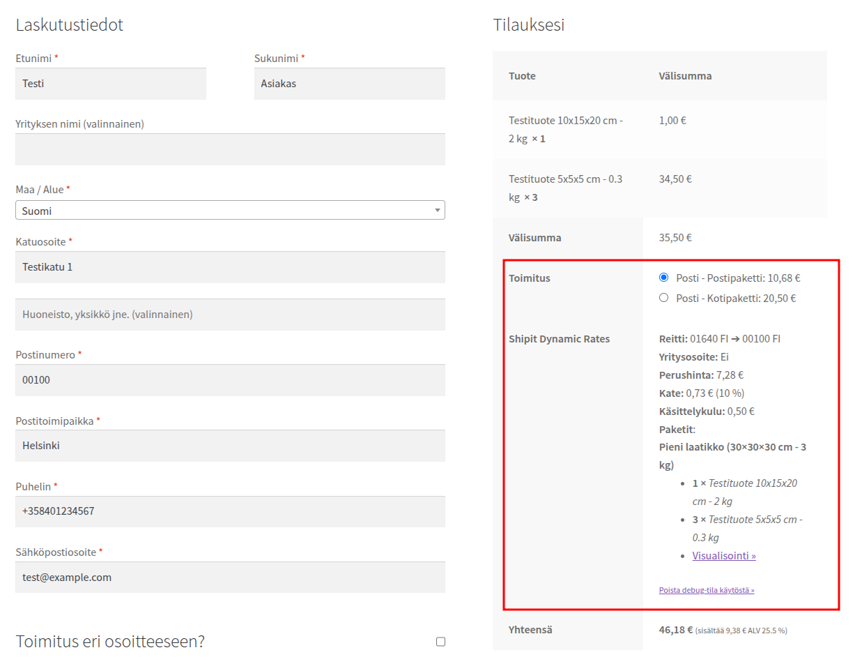 Huom! Debug-tila toimii tällä hetkellä ainoastaan WooCommercen perinteisellä kassalla (ei lohkokassalla).