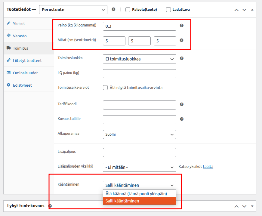 | Tyhjäpaino (kg) | Kuinka paljon pakkaus painaa ilman tuotteita. Lähetyksen paino lasketaan tuotteiden yhteenlasketusta painosta lisättynä tyhjäpainolla. |